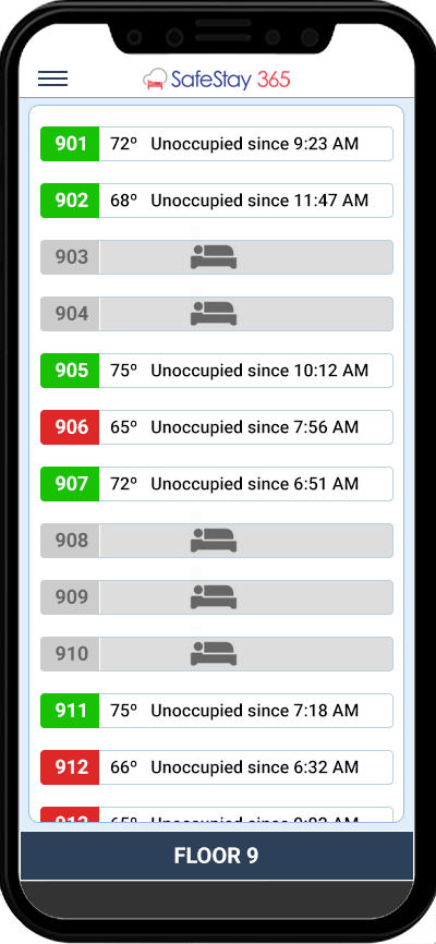 Cost Savings: SafeStay 365 will inform hotel management when rooms are occupied or vacant via a 24/7 monitoring system. This can be used to optimize housekeeping, assist maintenance, check-in availability, analytics for operations and most of all provide an additional layer of security to hotel guests that’s ubiquitous and non-invasive. It will also provide hotel guests with their room status in real-time, when it was serviced and the name of the housekeeper, and room temperature.